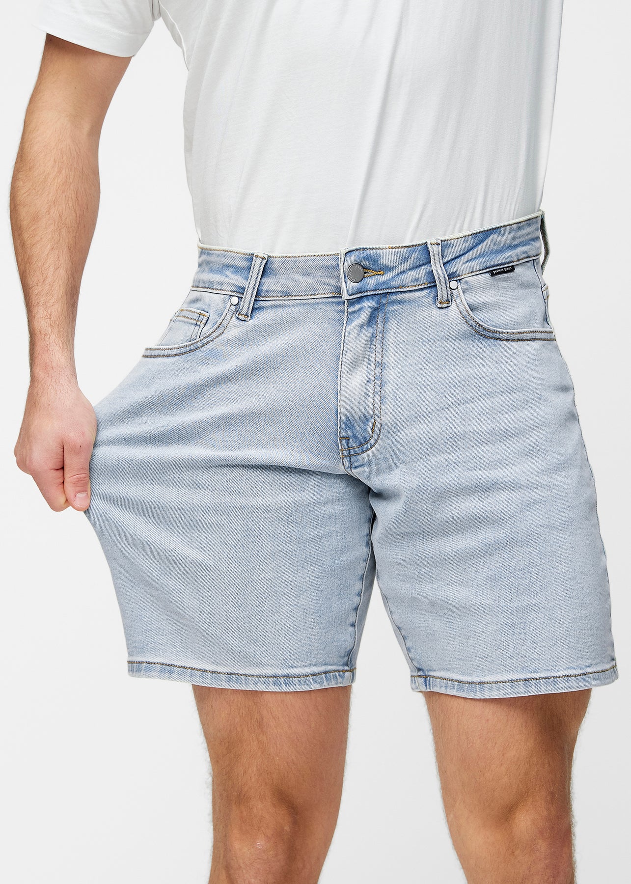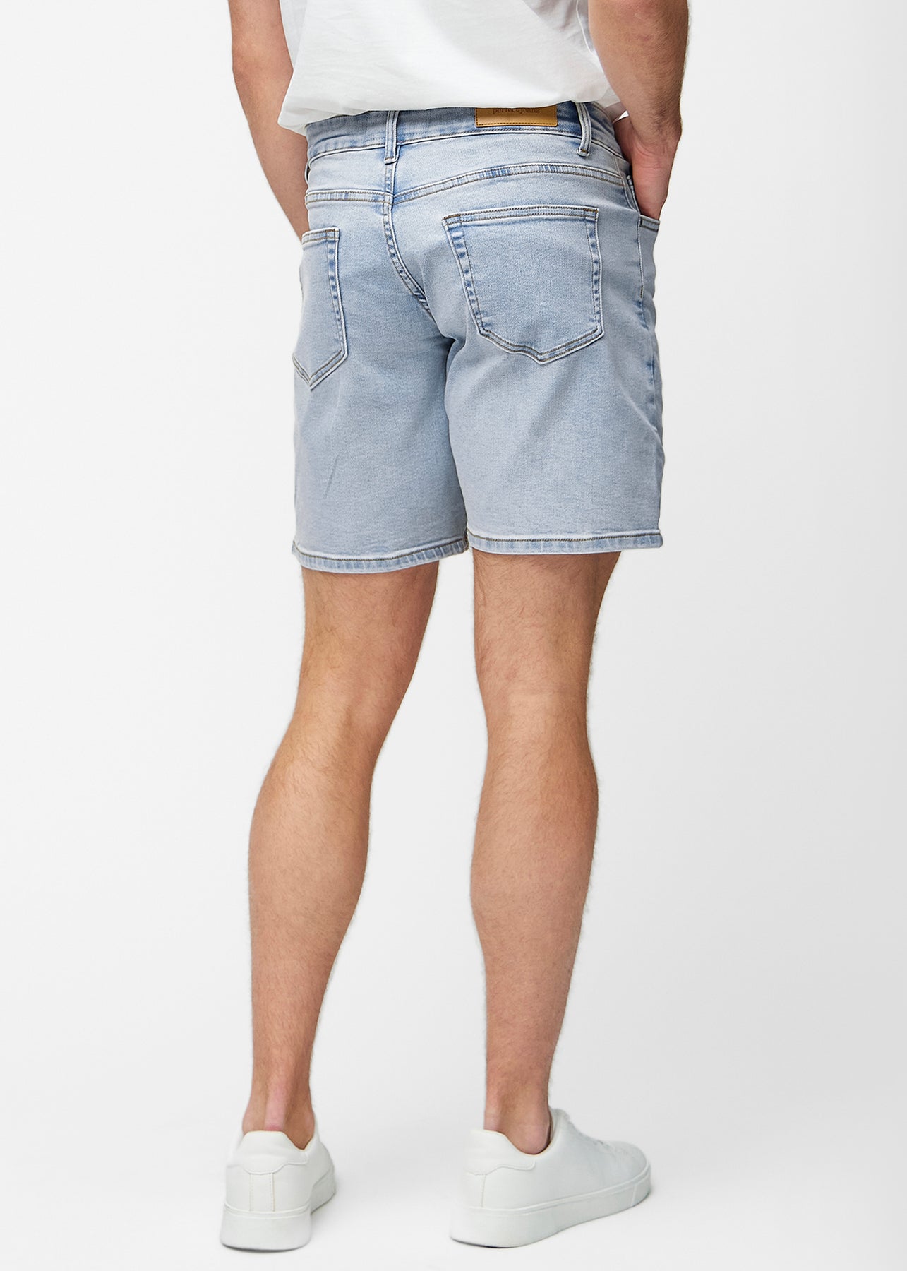 Ljusblå denimshorts för herr i färgen Waves med regular passform sett från sidan på modell.