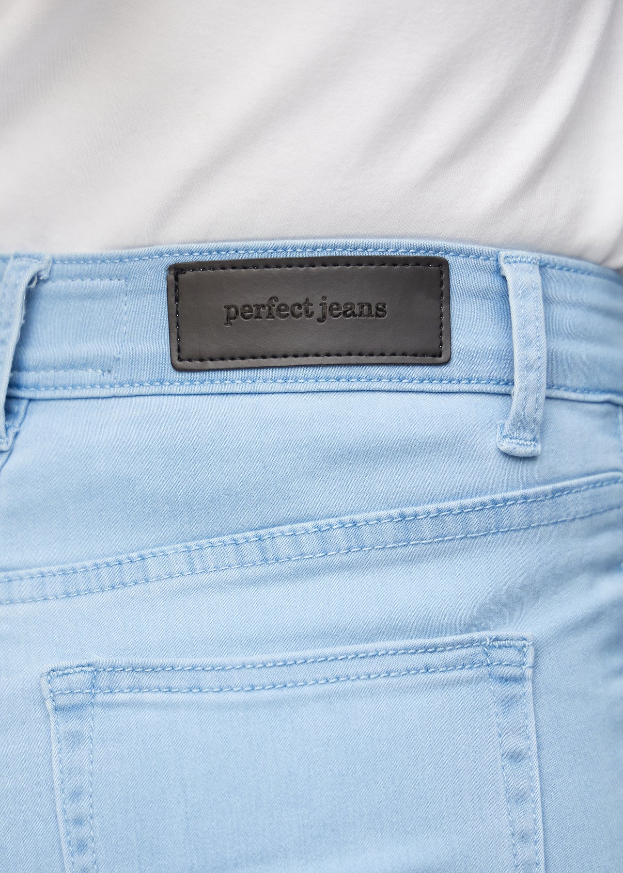 Nærbillede af lyseblåt jeansmateriale med Perfect Jeans læderpatch bagpå i taljen.