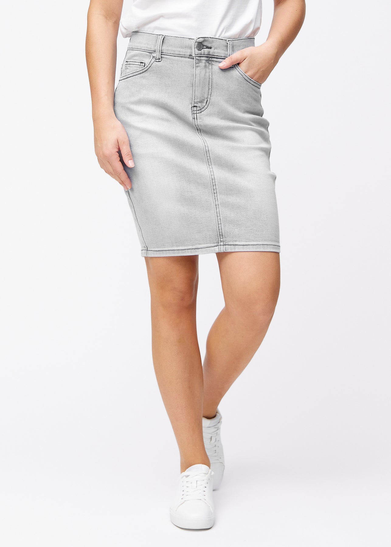 Lysegrå, tætsiddende og knælang denimnederdel i farven Ashes set forfra.